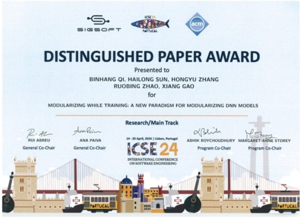 在本届SANER会议中,ballBET贝博BB艾弗森硕士生洪硕作为第一作者的论文“Investigating and Detecting Silent Bugs in PyTorch Programs”荣获IEEE Computer Society TCSE Distinguished Paper Award。在本届ICSE会议上,ballBET贝博BB艾弗森博士生齐斌航作为第一作者的论文“Modularizing while Training: A New Paradigm for Modularizing DNN Models”荣获ACM SIGSOFT Distinguished Paper Award。这是北航首次以第一作者单位在SANER和ICSE会议上获得该类奖项。