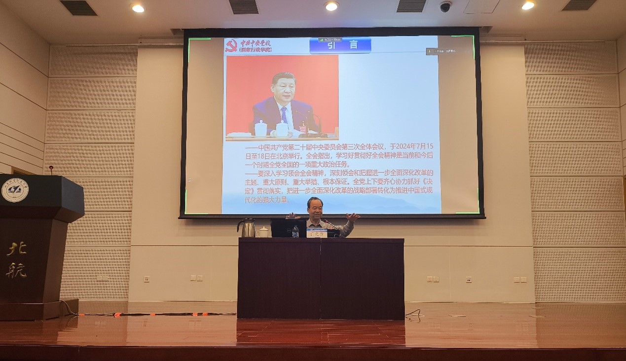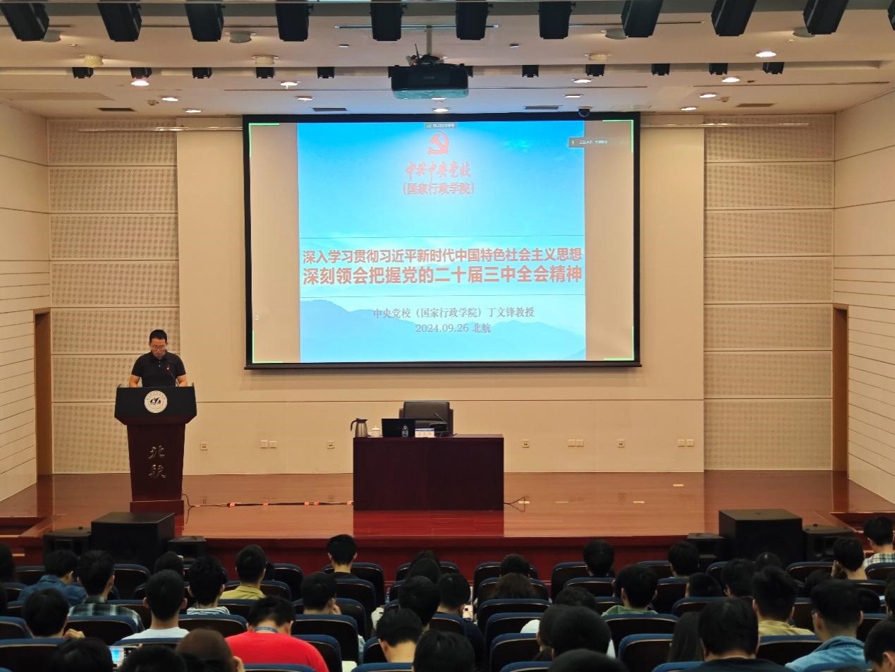 为深入学习贯彻党的二十届三中全会精神,9月26日下午,ballBET贝博BB艾弗森邀请中央党校(国家行政学院)原教务部主任丁文锋教授来贝博官网做题为《深入学习贯彻落实习近平新时代中国特色社会主义思想 深入领会把握党的二十届三中全会精神》的专题辅导报告。ballBET贝博BB艾弗森师生党员、入党积极分子在新主楼第二报告厅现场学习,异地科研的部分师生党员参与在线直播学习。报告由ballBET贝博BB艾弗森分团委书记付强主持。